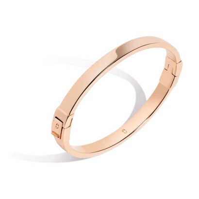 A high polished hinged bracelet clasps around the wrist, secured with a custom box clasp and button closure. At 6mm wide, the bracelet is everyday wearable boldness and offered in the 3 classic colors of Rose, White, or Yellow. Available in S/MD or MD/LG, this hidden logo piece is an instant AURATE classic.