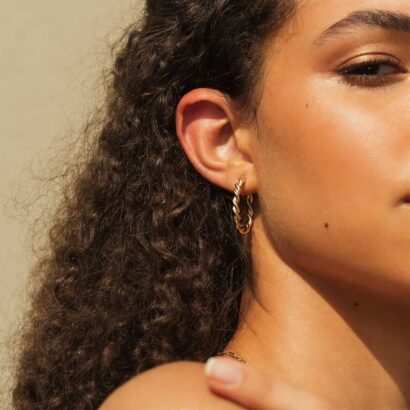 Gold hoop earrings featuring a bold spiral twist, secured by a post and wignut.